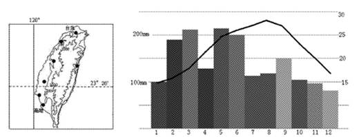 1、单选题 读“台湾地形图和台北的气温曲线降水柱状图”。完成下列各题。