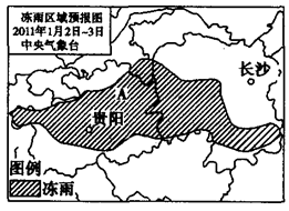 冬春季节,频繁南下的冷气团造成有些地区近地面的气温低于0℃,而上层气温仍然高于0℃,使得上层云中的水滴一直保持液态。当雨滴落入近地面空气层后冷却,并在较冷的地表物体上冻结成外表光滑而透明的冰层,气象学上称为“冻雨”。下图是“2011年1月2日~3日我国冻雨区预报图”。读图完成下列问题。