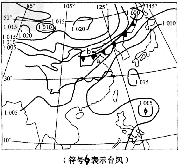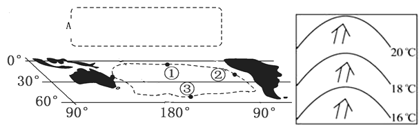 (1)左图中序号①②③代表的洋流中,水温分布可以用右图表示的是 ,在A线上加绘箭头表示该处气流运动方向。(4分)