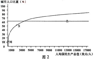 4、单选题 图2是世界各国城市人口比重与人均国民生产总值关系图。回答3-4题。