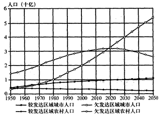 2、单选题 下图反映了世界较发达区域、欠发达区域1950~2050年城市和农村人口发展(含预测)情况。读图,完成1—2题。