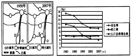 2、综合题 下面左图为某地区城市发展变化示意图,右图为G城人口变化示意图。读图回答下列问题。