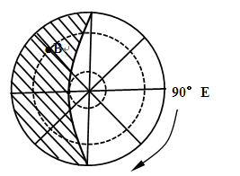 第(1)题,由“某日全球昼夜分布示意图”中北极圈以里极夜现象南极圈以里极昼现象可知此时为冬至日,所以此时太阳直射南回归线(23°26′S );又根据图中90°E平分昼半球,推知此时太阳直射点的地理坐标是(23°26′S? 90°E)。由90°E为中午12时,可推知0时线为90°W,90°W为西六区的中央经线,该区82.5W°-90°W仍为昨天,所以全部为今天的时区是西七区,起始经线为 97.5°W。又根据自东向西过国际日期变更线(180°)减去一天。所以按区时划分,此时地球上进入新一天的经度范围是97.5°W向东至180°。