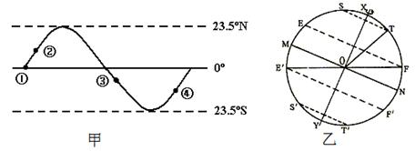 小题2:图乙中黄道面表示E"F;赤道面表示MN,故FON表示黄赤交角。