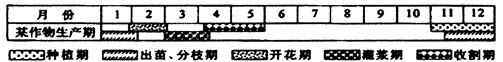 小题2:从图中看出该农作物的开花期在2月份,此时赤道正午太阳高度角正逐步变大,而地中海沿岸温和多雨,中国东北地区昼短夜长。