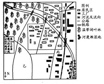 (4)考查城市化对地理环境的影响。丁地有大量的工厂,运输量大;工厂集中,人流量河和车流量大,且在此方向的道路只有一条,交通运输方式单一,无网络体系等待。