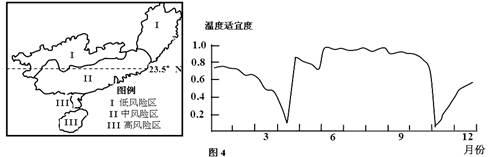 4、单选题 龙眼是典型的亚热带果树,气温高低直接决定其生长发育的适宜程度,因此可以用温度适宜度表示龙眼生长发育的风险状况。龙眼的温度适宜度随气温升高而增长,到达某一适宜值后,适宜度随气温升高迅速下降。读我国南方某些地区龙眼温度风险分区及各月龙眼温度适宜度变化图,完成题。