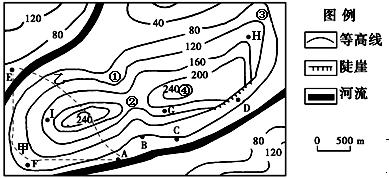 5、综合题 (13分) 下图为某地等高线地形图,结合所学知识完成下列各题。