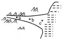 【小题1】图中河流a、b、c三处分别对应的是河流出山口、河流中游、河流下游入海口附近。因此,对应的外力依次是流水侵蚀、搬运、堆积作用。