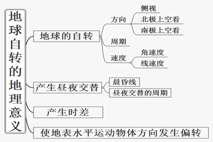 点评:本题难度较小,学生掌握自转的地理意义即可轻松作答。图解地球自转的地理意义: