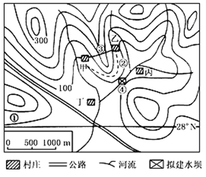 (4)水库选址原则是选在河谷、山谷或“口袋形”洼地或小盆地,库容大,工程量小;筑坝后丙地变为库区,水量增加,会淹没村庄和农田,需要移民。