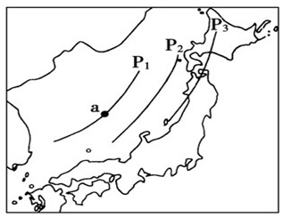 1.图中等压线数值排列正确的是2.此时a点盛行风是3.造成该岛上降雪集中于P3沿线地区的主导因素是