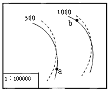 小题2:两条等温线与两条等高线相交于谷底,两交点海拔相差500米,温度相差约3℃,因为对流层的温度每升高100米气温降低0.60C,也就是说两条等温线差值为3℃,a、b两地位于两条等温线之间,温差应该小于3℃。故选A。