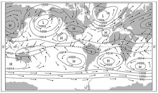 1、综合题 (10分)下图为世界某年某月的等压线分布图(单位:百帕)。图中甲地是一片缓和起伏的大草原。读图,回答下列问题。