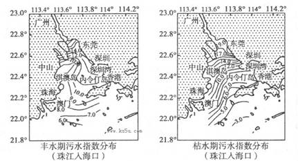 “污水指数”是水质评价的常用指标,“污水指数”越高,说明水污染越严重,水质越差。读“珠江入海口处污水指数分布图”,回答下列问题。