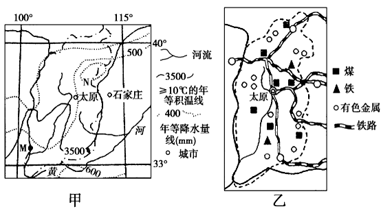 (2)根据所学知识说出影响甲图中≥10℃的年等积温线走向的主要因素,并分析太原和石家庄两地≥10℃积温存在明显差异的主要原因。(4分)