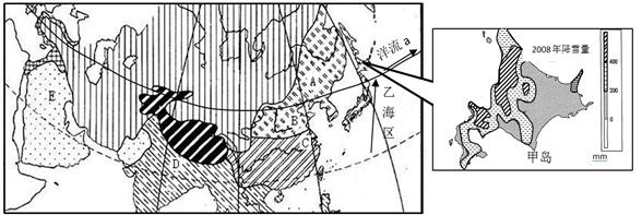 (3)D、E两地7月份气候差异很大,其最主要的影响因素是?。甲岛冬季多雪,形成图示降雪量分布状况的原因是?