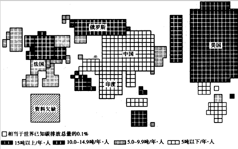 4、综合题 ? 随着世界经济的发展,二氧化碳的排放量不断增加。目前,碳排放已成为全球普遍关注的问题。下图是21世纪初某年世界部分国家碳排放状况分布示意图。据图回答第(1)题。