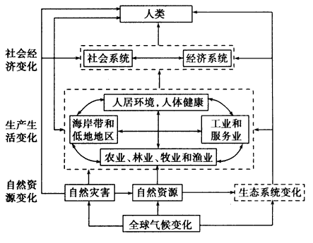 5、综合题 读“全球气候变化影响示意图”,回答下列问题。