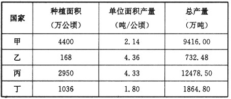 2、下表为2007年亚洲四个国家水稻生产情况统计表。甲、乙、丙、丁代表的国家依次是