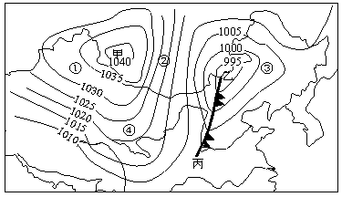 (1)图中甲地的天气系统是        (高、低)气压,从气流看属于      (气旋、反气旋),在其控制下空气_______(上升、下沉),多     (晴朗、阴雨)天气。