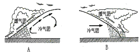 (2)图中乙—丙为     (冷、暖)锋,该锋面过境后,其天气状况是                    。下面       图是这类锋面的剖面示意图(填字母)。