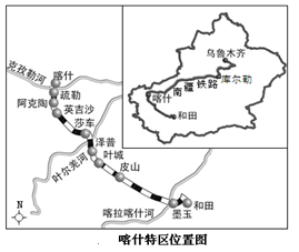 1、单选题 2010年5月,在中央新疆工作会议上中央正式批准喀什设立经济特区;作为中国的西大门,作为“丝绸之路”上的重镇,喀什与五国接壤,有6个国家一类口岸对外开放,12月30日,连接南疆8个县市的喀和铁路(如图所示)建成通车。读图完成下题。