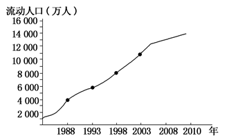 4、单选题 改革开放后中国流动人口逐年增加,读我国1988~2010年流动人口增长曲线图,完成小题。