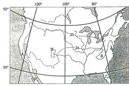 (1)M等值线为20和24等值线之间的闭合等值线,其值可能为20或24;但M等值线内为河流的源头,海拔高,气温应较低;故M等值线的值为20。