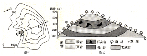 1、单选题 图甲为某农村聚落M所在区域的等高线地形图,OP实际水平距离为425米。图乙为沿 PQ一线所做的地质剖面示意图。M聚落分布于两边山脊对称的宽谷中,当一年中·M聚落房屋的正午日 影最长时,当弛正午太阳高度大致与甲坡坡度相等,且该日M聚落的日照时间从北京时间 8△ 0至 1⒎ 5Q,读图文材料回答下列各题 。(已 知:tan3俨 =0.58? tan35° ="0,7" t al140° =0,84)