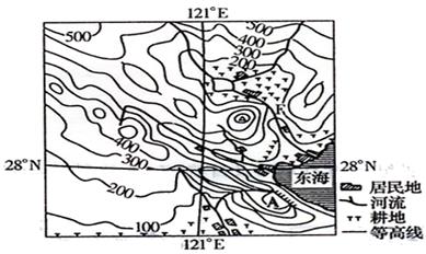 小题1:本题考查陡崖相对高度的计算。陡崖相对高度计算公式:(n-1)d≤H<(n+1)d(n表示相交的等高线条数,d表示等高距),A处陡崖4条等高线相交,等高距为100米,则相对高度为300≤H<500米。所以本题选择B选项。
