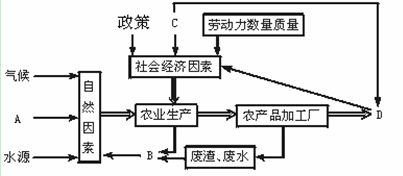 1.图中字母B是土壤,那么字母2.由于世界各地农业的生产的主要因素差别很大,形成了农业极为明显的3.下列农业生产受图中D因素影响较大的是