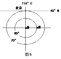 1、单选题 图5为某时刻我国局部地区太阳高度分布示意图,图中圆圈为等太阳高度线,水平直线表示纬线,竖直的直线表示经线,读图回答1~2题。