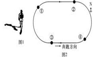 小题1:该地位于(34°N,117°E)→北回归线以北;其身影向正北→为当地中午,太阳位于正南;图1中某运动员身影在其斜前方→说明在朝偏北方向(东北方向)跑,符合此条件的四地中只有④,图示时刻①身影位于其斜后,③?身影位于其正左侧,②身影位于其正右侧,本题选 A项。
