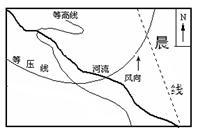 4、单选题 图为“中纬度某地某日河流、风向、等压线、等高线、晨线的组合图”,读后回答下面问题