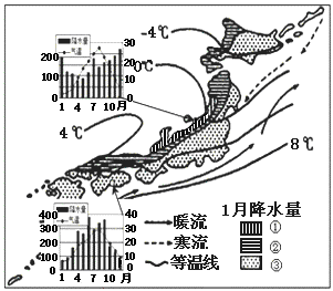 1、单选题 如图为日本1月气温.降水分布图,回答问题?