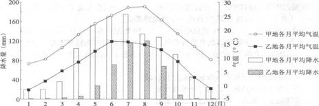 4、单选题 我国甲、乙两地均位于29°N附近。读1971—2000年甲、乙两地各月气温和降水分布图,可知( )