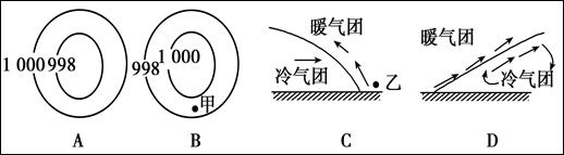 小题1:根据图示的气压分布和气团的运动方向可判断,A图为低压中心;B图为高压中心;C图为冷锋;D图为暖锋。