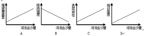 植被覆盖率增加,水土流失少,河流含沙量应减少,A错。降雨强度大,冲刷能力强,河流含沙量增大,B错。表层岩性提高,不易被流水侵蚀,河流含沙量减小,C错。相对高度越大,落差大,水流侵蚀能力强,河流含沙量大,D对。