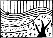 2、单选题 该图所示的岩石分布状态图中,黑色代表的是岩浆通道,甲、乙两处岩石可能分别是