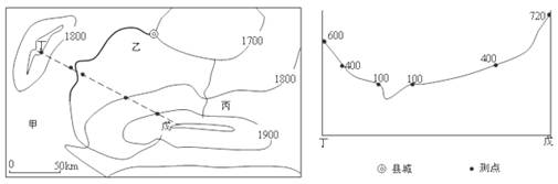 【小题2】该研究性学习小组根据相关地质部门资料,绘制出丁到戊的地质统计图(右图),曲线上各数据表示各测量点对应的地下某相同岩层的深度,则可以判断出沿该剖面线为( )