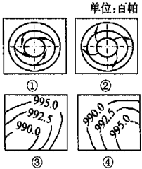 本题考查常见天气系统与天气。低压系统中心盛行上升气流容易形成降水,高压系统中心盛行下沉气候,天气晴朗。图中①和③为低压系统,容易出现阴雨天气。所以本题选择B选项。
