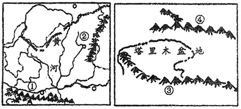 【小题1】中国地势西高东低,呈三级阶梯分布。第一阶梯和第二阶梯的分界山脉是昆仑山脉、祁连山脉、横断山脉一线,第二阶梯级和第三阶梯的分界山脉是大兴安岭、太行山、巫山、雪峰山一线。根据图中山脉的走向和地理位置分析判断:其中地处地势三级阶梯交界处的是②太行山脉,③昆仑山。处于暖温带和中温带分界处的是④天山,位于亚热带季风气候和温带季风气候分界处的是①秦岭。