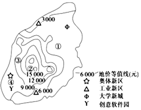 【小题2】图中可以看出,该区域布局有奥体新区、创意软件园,属于高附加值产业,近年来④地地价涨幅较大,应该是这类产业集聚引起,使该区域成为新的经济增长点。故选A。