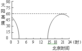 【小题1】由图可知该地太阳高度大于0的北京时间范围是15时到凌晨3时,所以该地昼长是12小时;若该地在赤道上,根据正午太阳高度计算公式:H=90°-纬度差(所求点纬度与直射点纬度之差)可知,冬、夏二至日都为66°34′,图中显示该地正午太阳高度是60°,故排除选项A、B;所以此时应该是二分节气,全球昼夜等分,由于该地该日正午时太阳位于正北方向,那么该地应该位于南半球,故选项D正确。