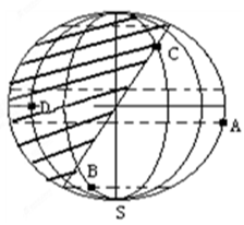 (2)图中赤道与晨线交点是6点,根据图中等份判断,A点的时刻为12:00,B点的时刻是4:00,D点位于赤道上,日出时间为6:00,C点的昼长是8小时。