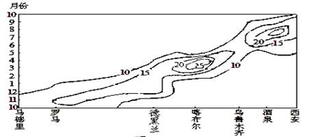 1、单选题  图为西班牙马德里到中国西安的各月降水占全年降水的百分比等值线分布。