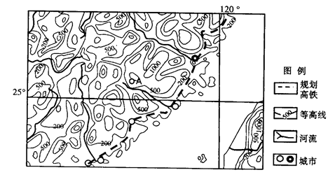 下图为中国某区城图,图中A县适宜毛杜鹃等许多花卉生长,特别是桂花种植已有百年历史。早在20世纪80年代末,该县就开始发展花卉产业,近年花卉种植面积不断增加,并提出“打造乡土特色花卉基地”的区城规划目标。图中虚线为我国规划建设的沿海高速铁路在本区的分布。