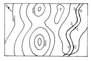 1.图中P地的地形是2.图中河流的两岸六地中,在自然状态下侵蚀较重的是