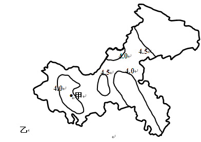 1.图中甲地降水的PH值可能为2.据图中信息所示,乙地区可能的地形区是
